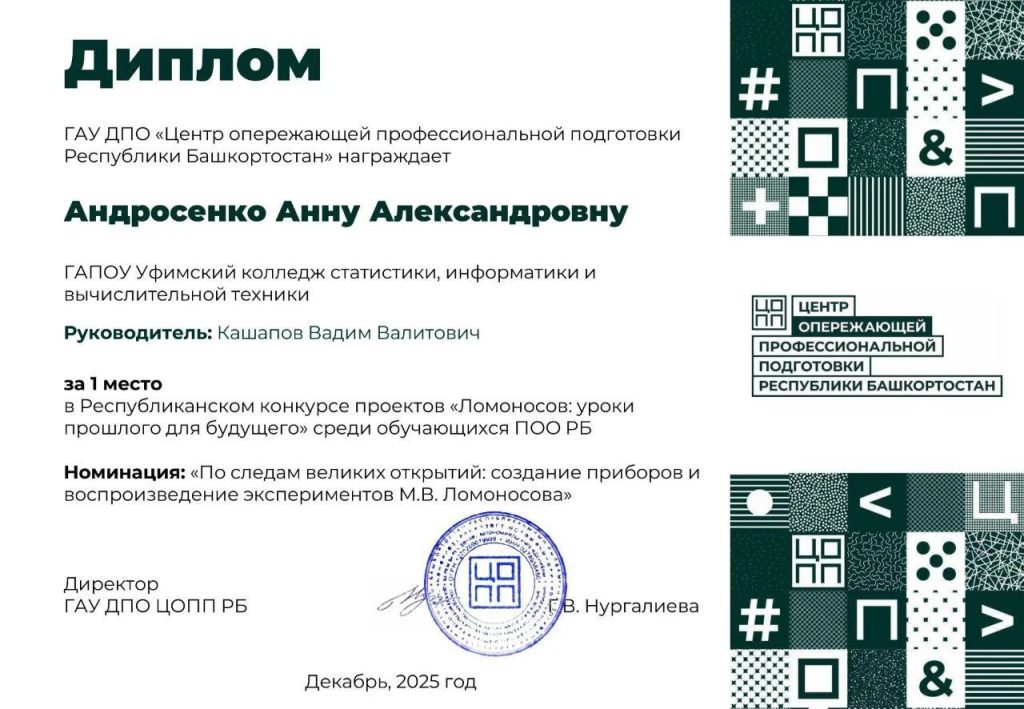 Студентка группы 25П-1 Андросенко Анна победитель в конкурсе проектов «Ломоносов: уроки прошлого для будущего» в номинации